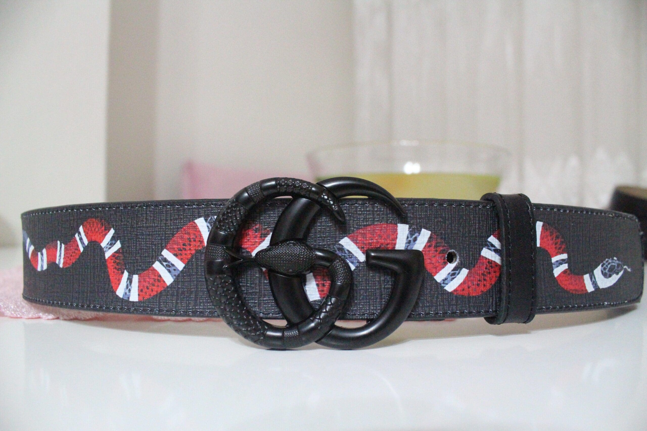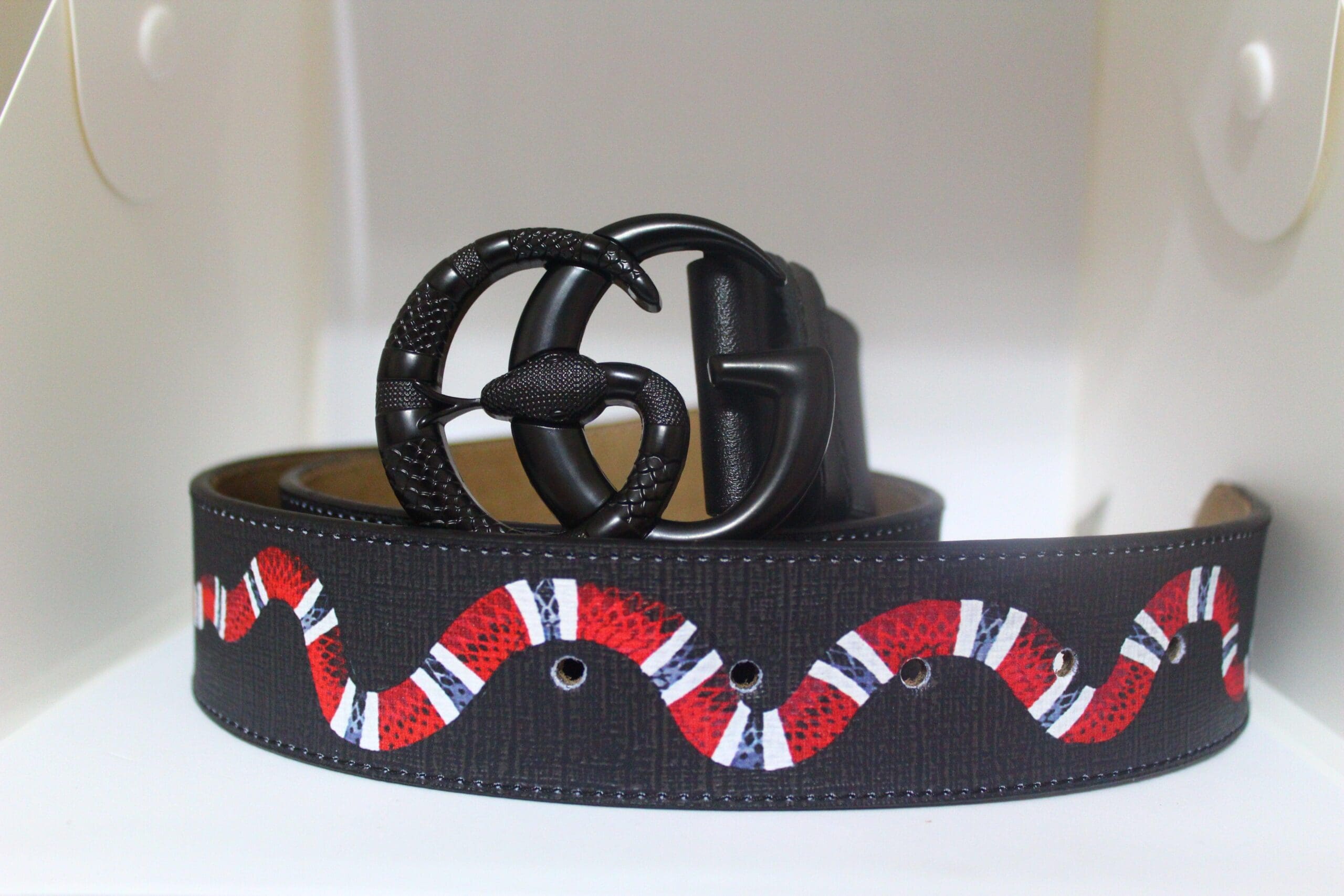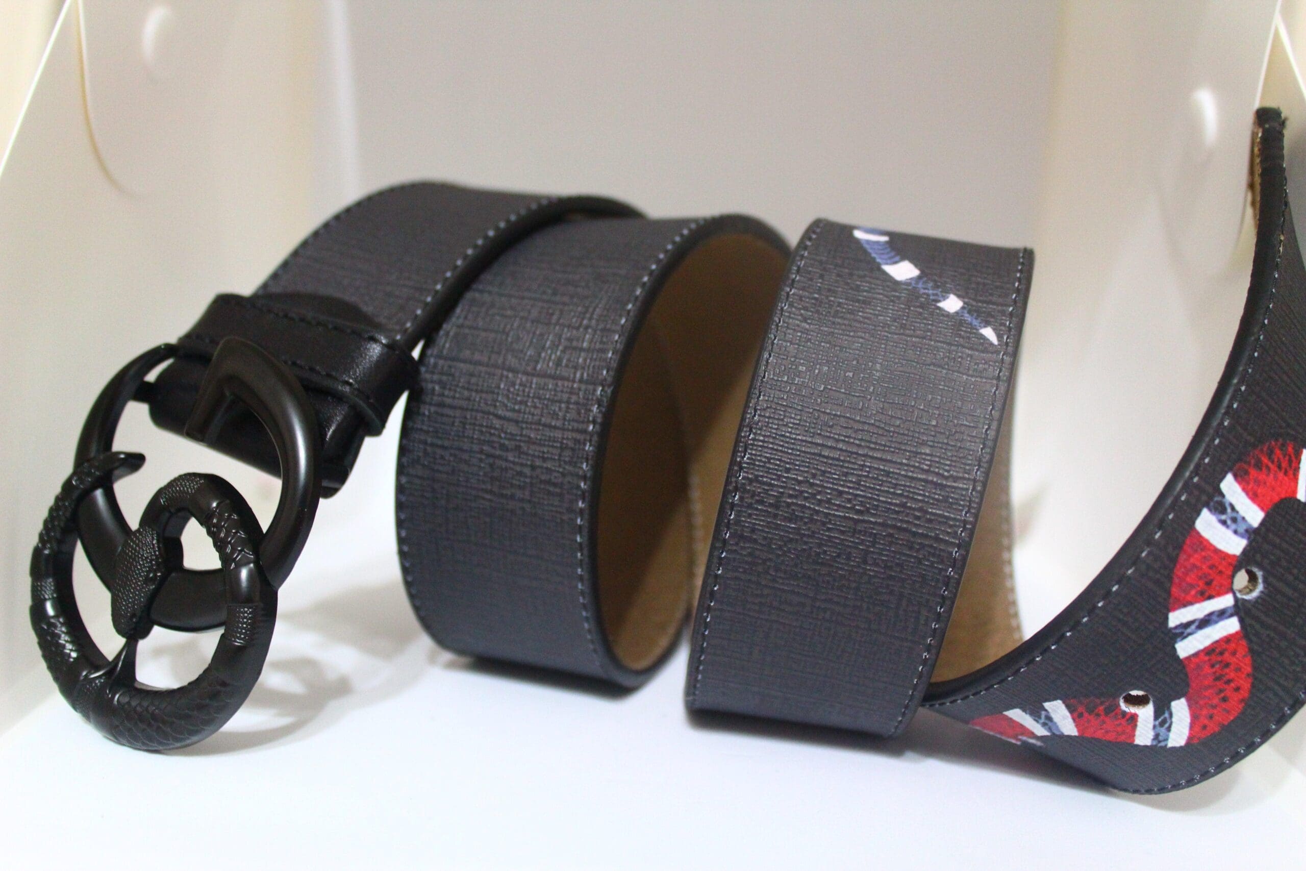 A black leather belt with an Interlocking G Snake buckle. One of the House’s most emblematic symbols, the monogram logo is presented in contrasting Black tones for a modern feel.