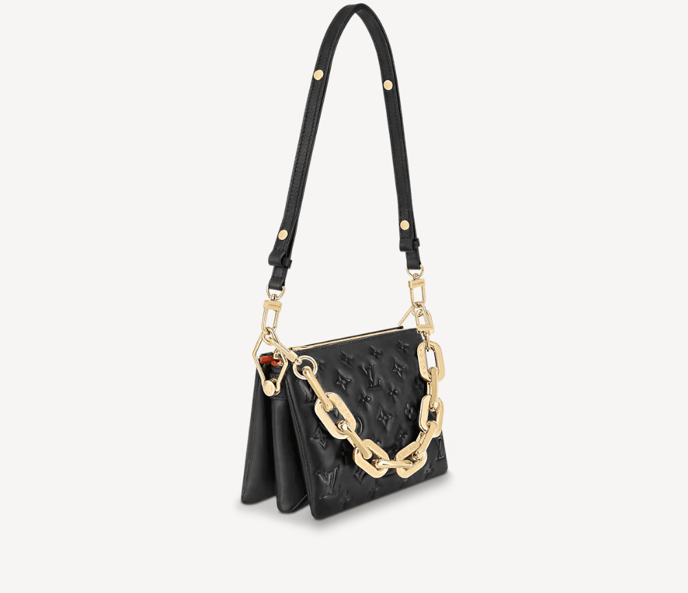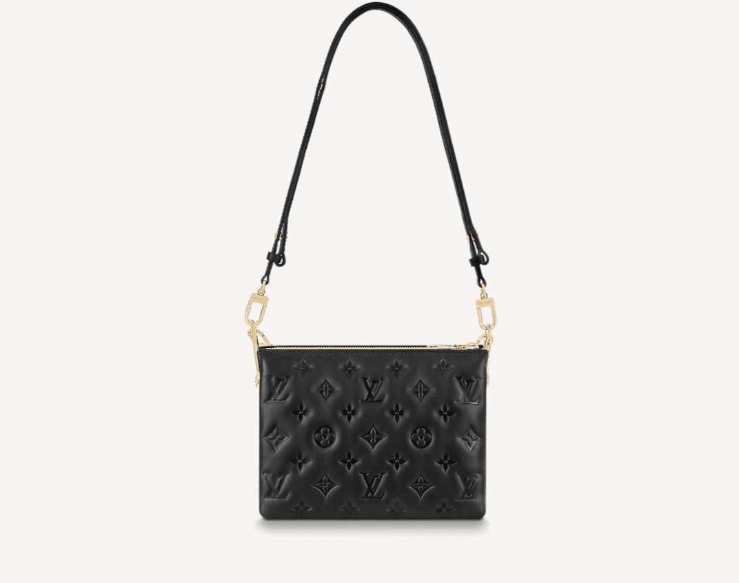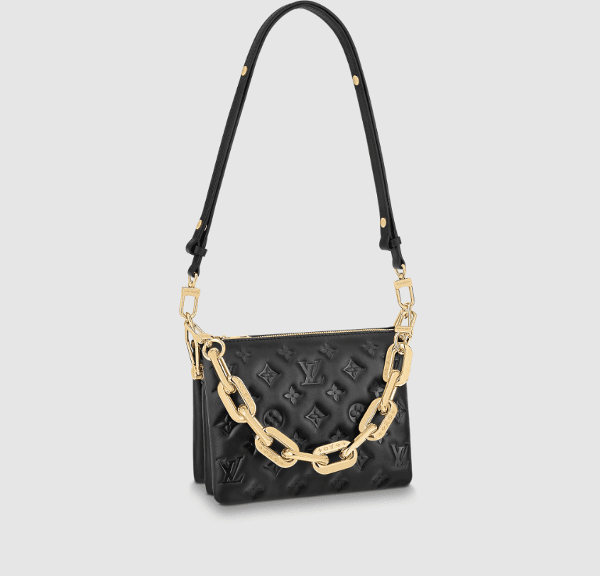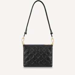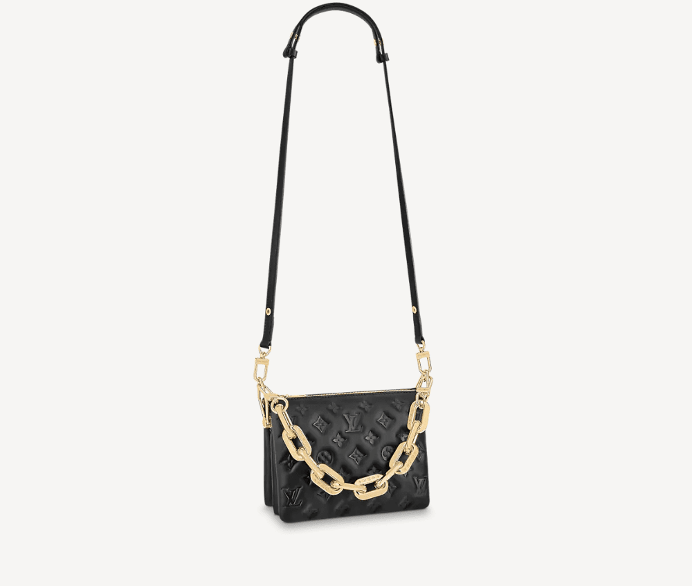 The Louis Vuitton COUSSIN BB Bag is crafted from Monogram-embossed puffy lambskin and calfskin leather trim. A versatile luxury accessory with removable straps.