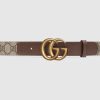 The House GG monogram in its emblematic beige/ebony color combination is matched with black leather in this belt introduced for Pre-Fall 2020. The Double G buckle with an aged finish completes the accessory.