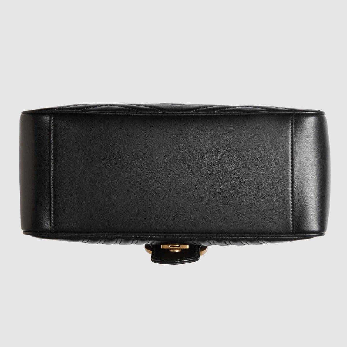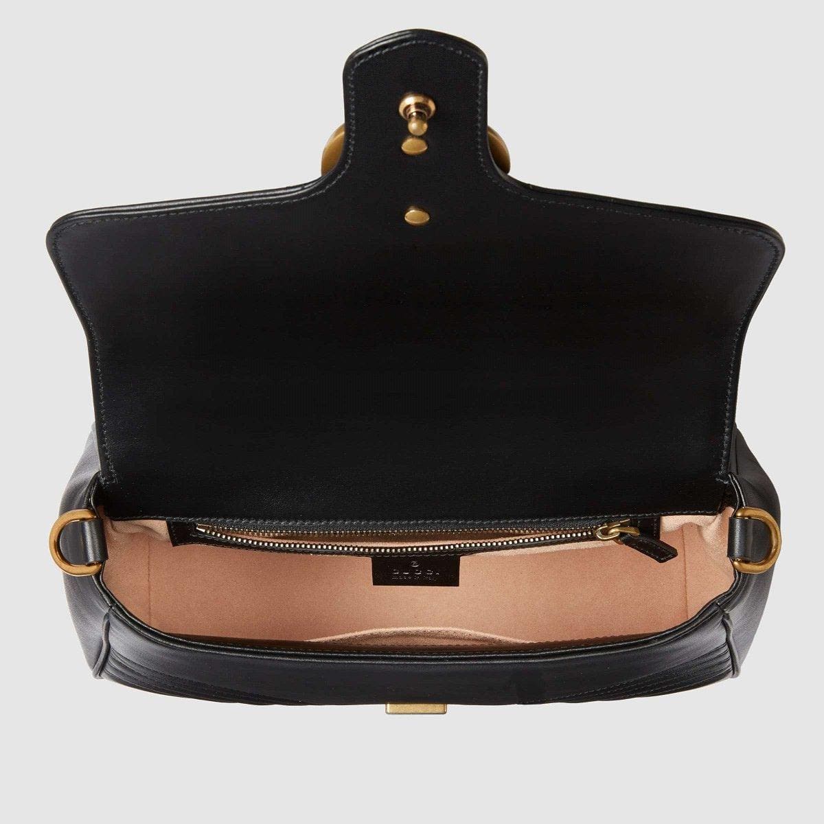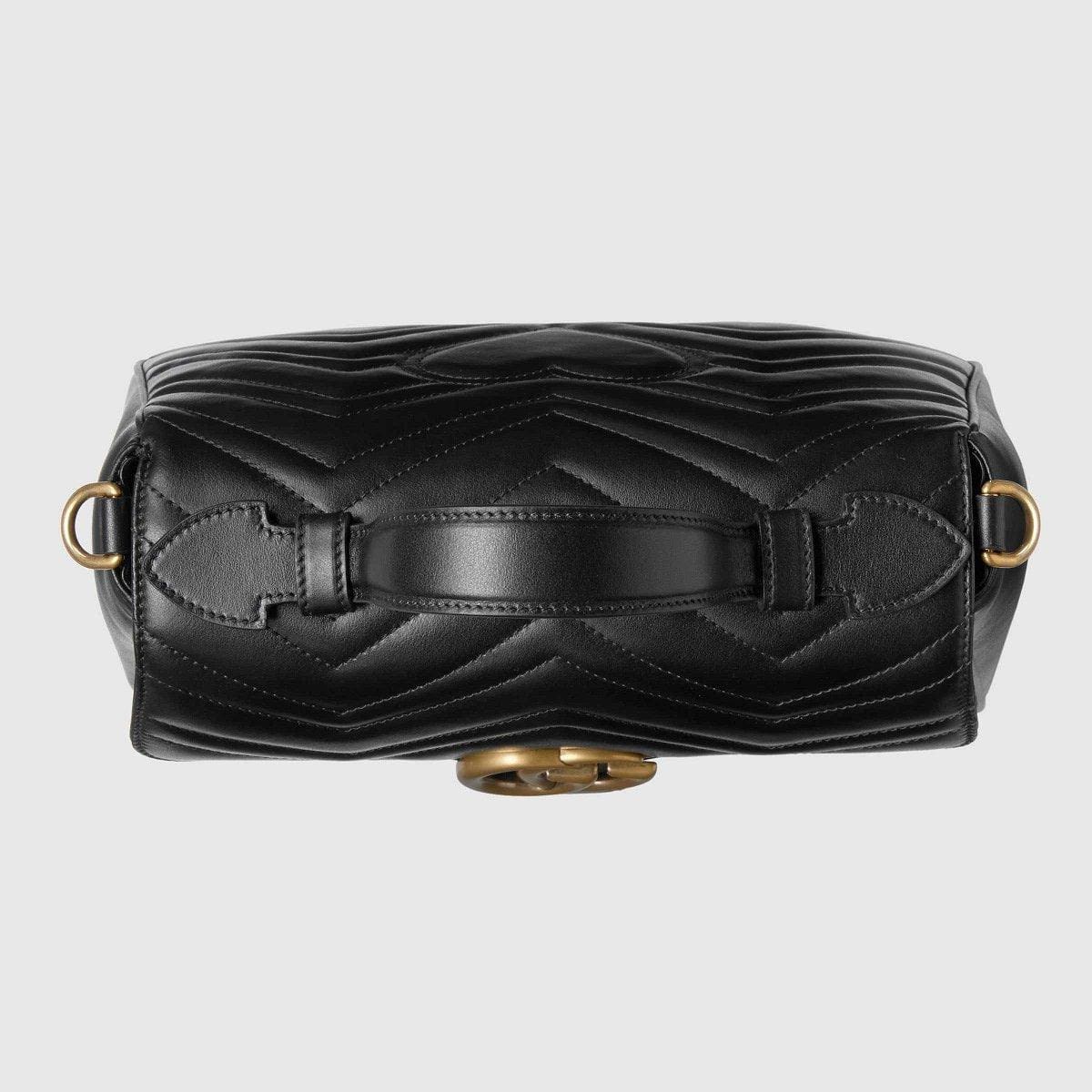 The small GG Marmont top handle bag has a softly structured shape and an oversized flap closure with Double G hardware. Made in matelassé chevron leather with a heart on the back.