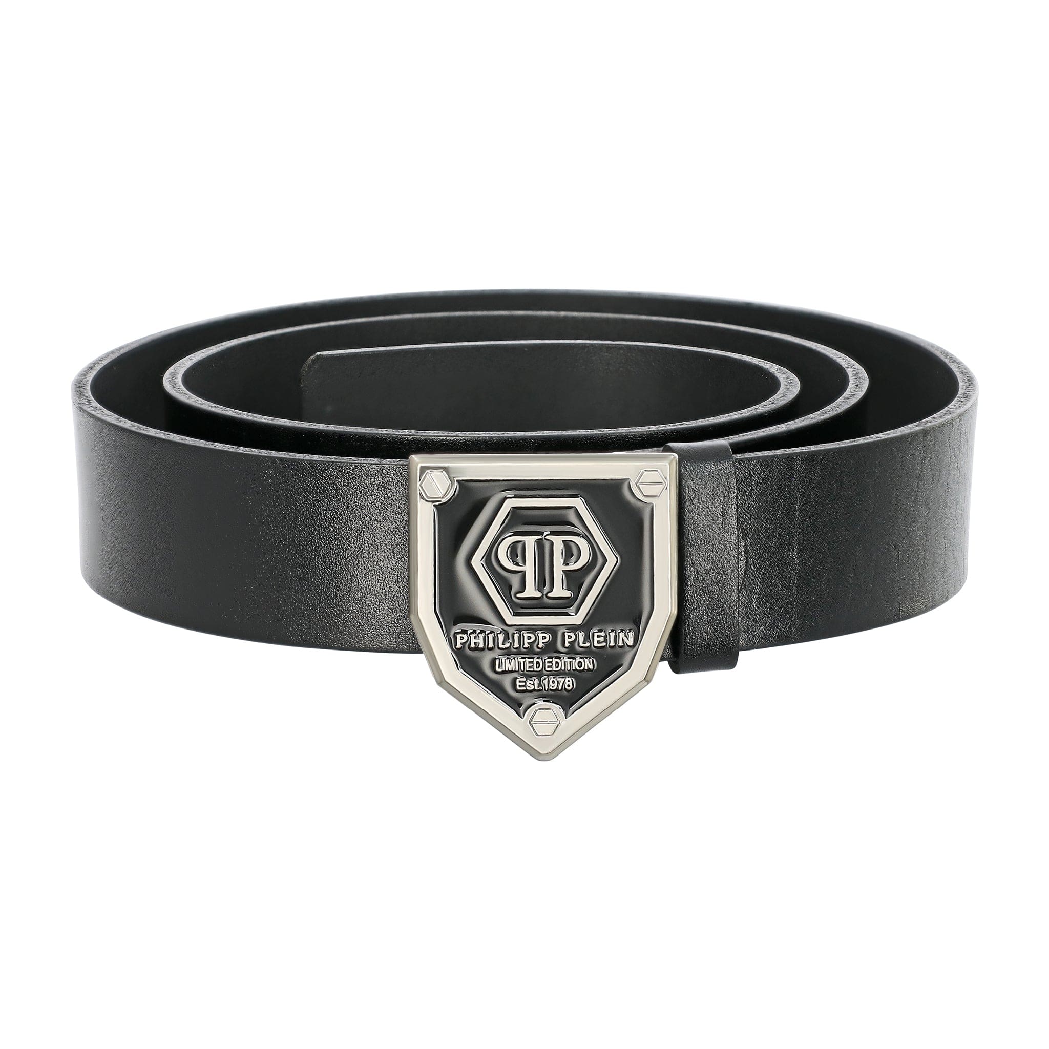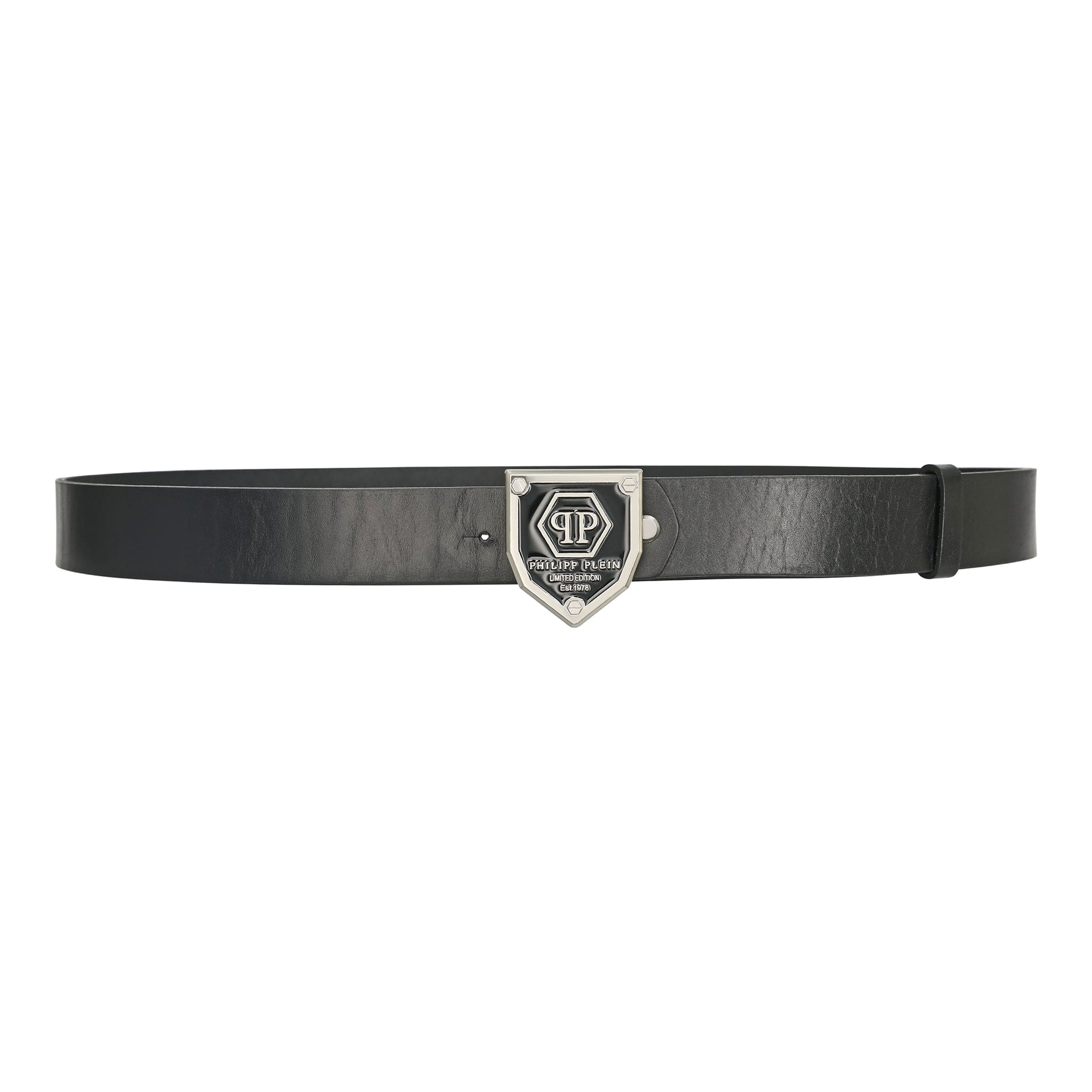 Leather belt. Enamelled metal buckle with the iconic PP Hexagon. Leather lining. Height: 4 cm.